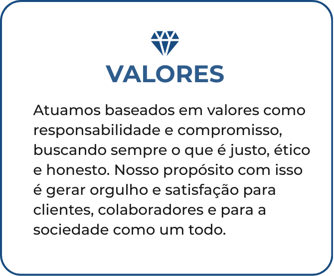 Valorizamos relações sólidas, transparência em cada etapa e o compromisso de entregar mais do que resultados, entregamos valores que fazem a diferença.